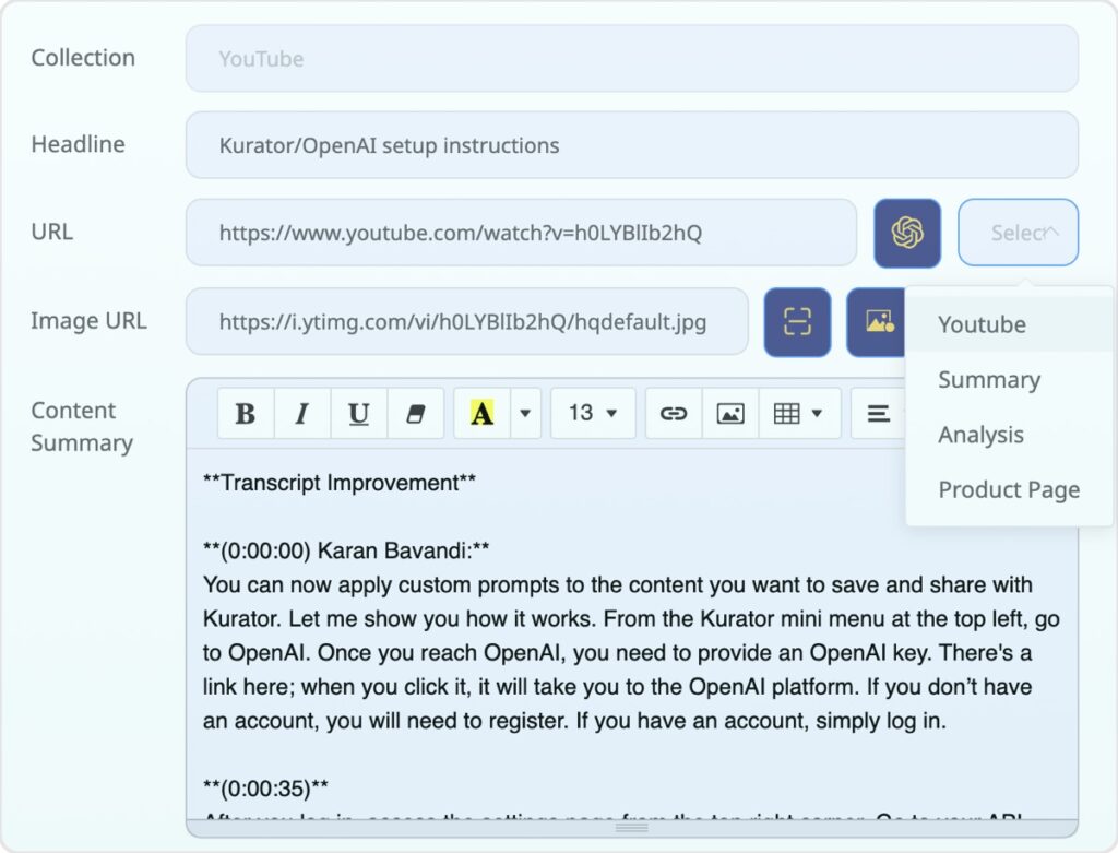Kurator’s OpenAI integration lets you supercharge your content curation by connecting your app with OpenAI’s powerful language models. With this feature, you can create custom prompts and automatically generate summaries, tags, or any other AI-enhanced content while saving links to Kurator.
